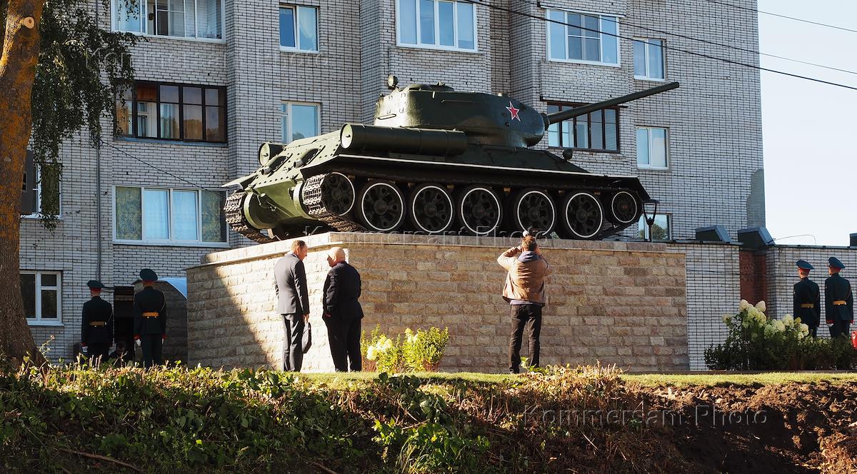 Церемония открытия памятника танк Т-34, установленный на месте форсирования реки Наровы войсками Ленинградского фронта, прорыва немецко-фашистской обороны и освобождения города Нарвы 25-26 июля 1944 года. Памятник - точная копия танка Т-34, демонтированного в Нарве по решению эстонских властей в августе 2022 года.