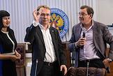 Единый день голосования. Заместитель председателя ТИК ДЭГ Олег Артамонов (справа) и председатель комиссии Общественной палаты Москвы по технологиям "Умного города" Илья Массух (в центре) во время завершения процедуры дистанционного электронного голосования в Центральной избирательной комиссии (ЦИК) России.