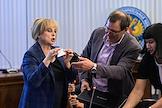 Единый день голосования. Заместитель председателя Центральной Избирательной Комиссии (ЦИК) России Николай Булаев (слева) и председатель ЦИК России Элла Памфилова (справа) во время завершения процедуры дистанционного электронного голосования в Центральной избирательной комиссии (ЦИК) России.