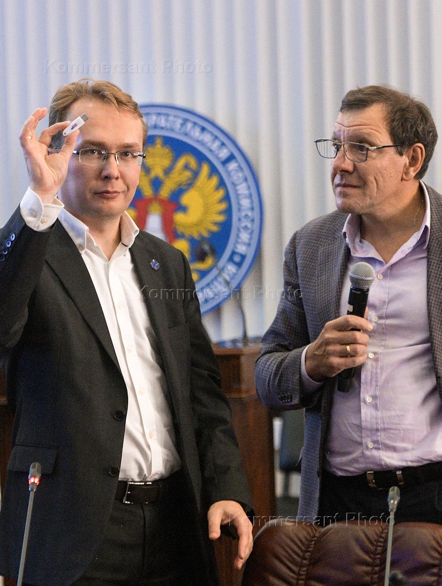 Единый день голосования. Заместитель председателя ТИК ДЭГ Олег Артамонов (слева) и председатель комиссии Общественной палаты Москвы по технологиям "Умного города" Илья Массух (справа) во время завершения процедуры дистанционного электронного голосования в Центральной избирательной комиссии (ЦИК) России.