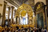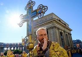 Крестный ход по Невскому проспекту от Казанского кафедрального собора к Александро-Невской лавре, приуроченного ко дню перенесения мощей святого князя Александра Невского в Санкт-Петербург. Митрополит Санкт-Петербургский и Ладожский Варсонофий (справа) во время службы в Казанском кафедральном соборе.
