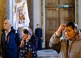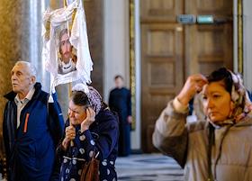 Крестный ход по Невскому проспекту от Казанского кафедрального собора к Александро-Невской лавре, приуроченного ко дню перенесения мощей святого князя Александра Невского в Санкт-Петербург. Верующие во время службы в Казанском кафедральном соборе.