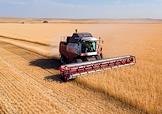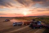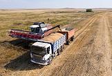 Сбор урожая пшеницы в Оренбургской области. Работа комбайнов на полях. Загрузка зерна в кузов грузового автомобиля.
