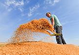 Сбор урожая пшеницы в Оренбургской области. Загрузка зерна в кузов грузового автомобиля.