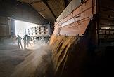 Сбор урожая пшеницы в Оренбургской области. Разгрузка зерна из кузова грузового автомобиля на зернохранилище.