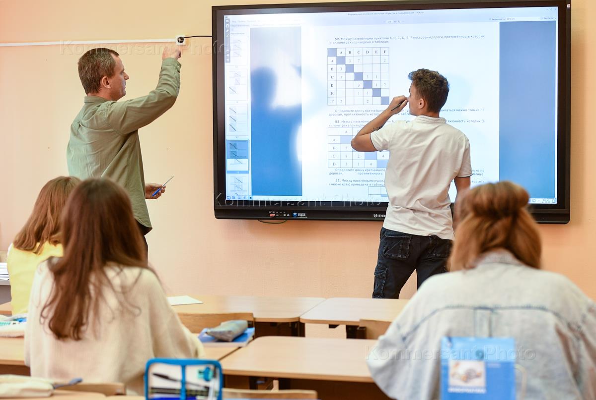 School No. 1466 named after Nadezhda Rusheva on Yerevanskaya street. Genre photography. The teacher at the blackboard during the lesson.
