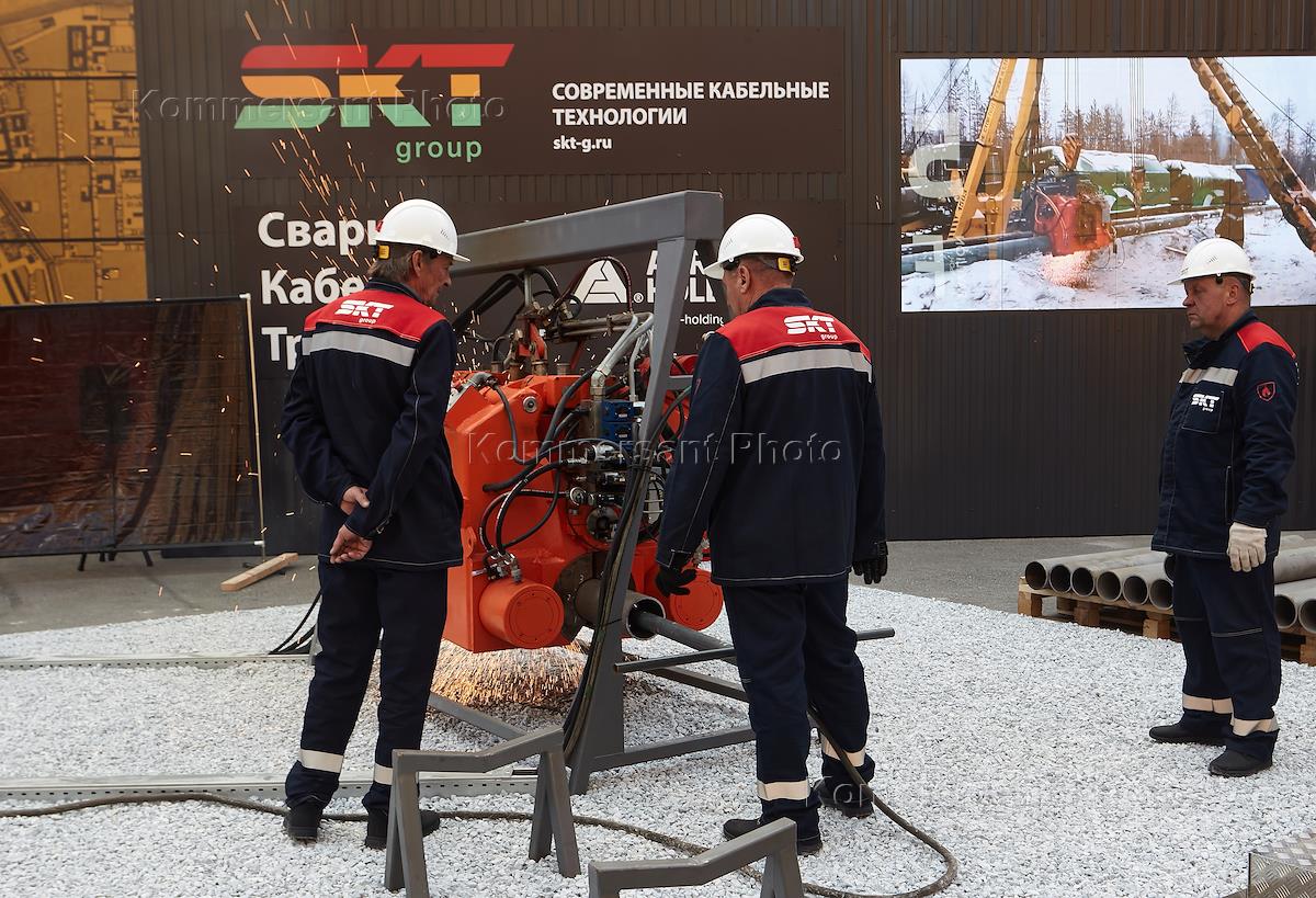 XI Петербургский международный газовый форум (ПМГФ–2022) в конгрессно-выставочном центре "Экспофорум". Жанровая фотография. Стенд компании SKT Group (современные кабельные технологии) на форуме.