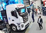 XI Петербургский международный газовый форум (ПМГФ–2022) в конгрессно-выставочном центре "Экспофорум". Жанровая фотография. Стенд с автомобильной техникой из Китая.