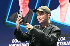 Форум Blockchain Life, посвященный криптовалютам, блокчейну и майнингу, на инновационной площадке Music Media Dome. Художник Покрас Лампас во время форума.