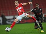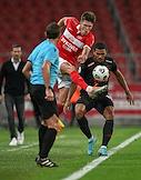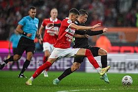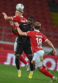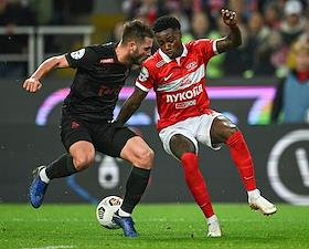 Российская Премьер-Лига (РПЛ). МИР - Чемпионат России по футболу 2022/2023. 10 тур. Матч между командами "Спартак" (Москва) - "Локомотив" (Москва) на стадионе "Открытие Арена". Игрок команды "Спартак" Квинси Промес (справа) во время матча.