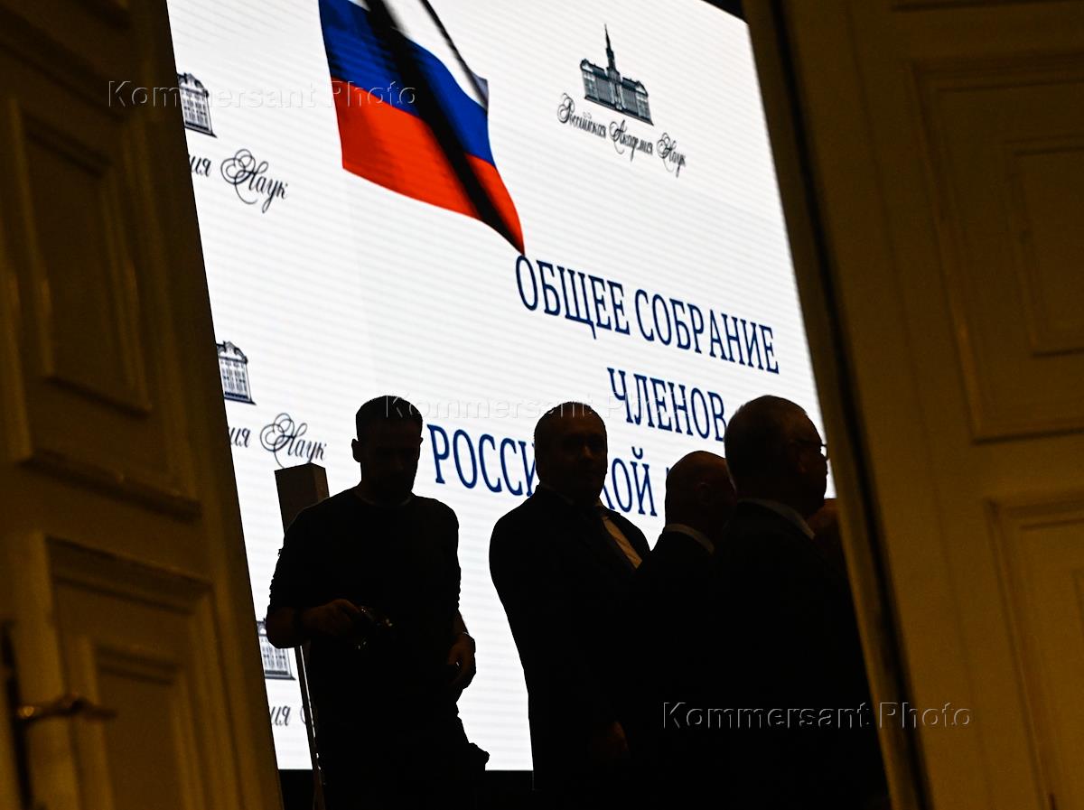 Общее собрание академиков Российской академии наук (РАН), посвященное выборам президента РАН, в Большом зале РАН. Академик РАН Александр Сергеев (в центре) во время собрания.