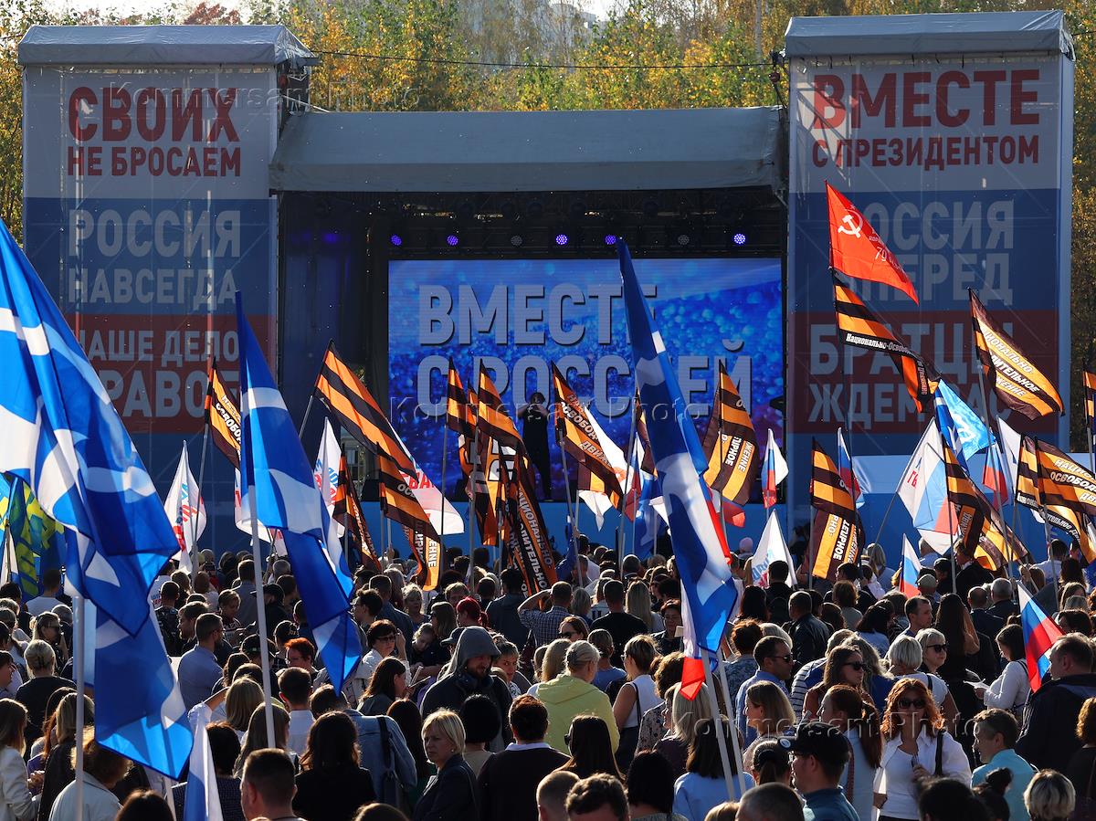 Митинг-концерт в поддержку референдумов о присоединении к России ДНР, ЛНР и частей Херсонской и Запорожской областей Украины прошел на площади перед Дворцом молодежи. Участники во время митинга-концерта.