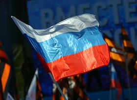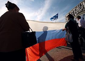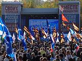 Митинг-концерт в поддержку референдумов о присоединении к России ДНР, ЛНР и частей Херсонской и Запорожской областей Украины прошел на площади перед Дворцом молодежи. Жанровая фотография. Флаг России.