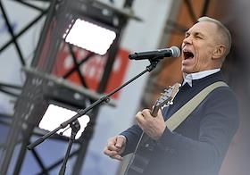 Акция "Своих не бросаем", организованная Общероссийским народным фронтом" (ОНФ), прошла на Манежной площади. Музыкант Александр Ф. Скляр во время выступления.