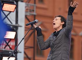Акция "Своих не бросаем", организованная Общероссийским народным фронтом" (ОНФ), прошла на Манежной площади. Певица Юлия Чичерина во время выступления.