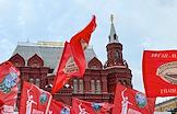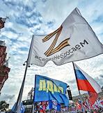 Акция "Своих не бросаем", организованная Общероссийским народным фронтом, на Манежной площади. Жанровая фотография. Флаги Национально-Освободительного движения (НОД) в руках участников акции.