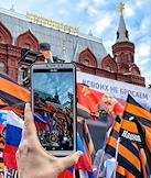 Акция "Своих не бросаем", организованная Общероссийским народным фронтом, на Манежной площади. Жанровая фотография. Участник фотографирует на мобильный.