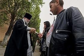 Частичная мобилизация на территории России. Президент России Владимир Путин 21 сентября 2022 года объявил о частичной военной мобилизации. В ответ на обращение глав ДНР и ЛНР в феврале 2022 года Россия проводит специальную военную операцию на Украине. Мобилизованные жители на сборном пункте военного комиссариата Советского, Ворошиловского и Кировского районов. Священнослужитель во время проводов мобилизованных.