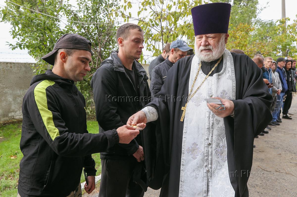 Частичная мобилизация на территории России. Президент России Владимир Путин 21 сентября 2022 года объявил о частичной военной мобилизации. В ответ на обращение глав ДНР и ЛНР в феврале 2022 года Россия проводит специальную военную операцию на Украине. Мобилизованные жители на сборном пункте военного комиссариата Советского, Ворошиловского и Кировского районов. Священнослужитель во время проводов мобилизованных.