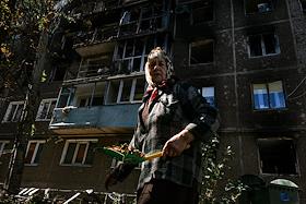 Проведение референдумов о вхождении в состав России Донецкой народной республики (ДНР), Луганской народной республики (ЛНР) и освобожденных территорий. Жанровая фотография. Женщина убирает мусор во дворе жилого дома.