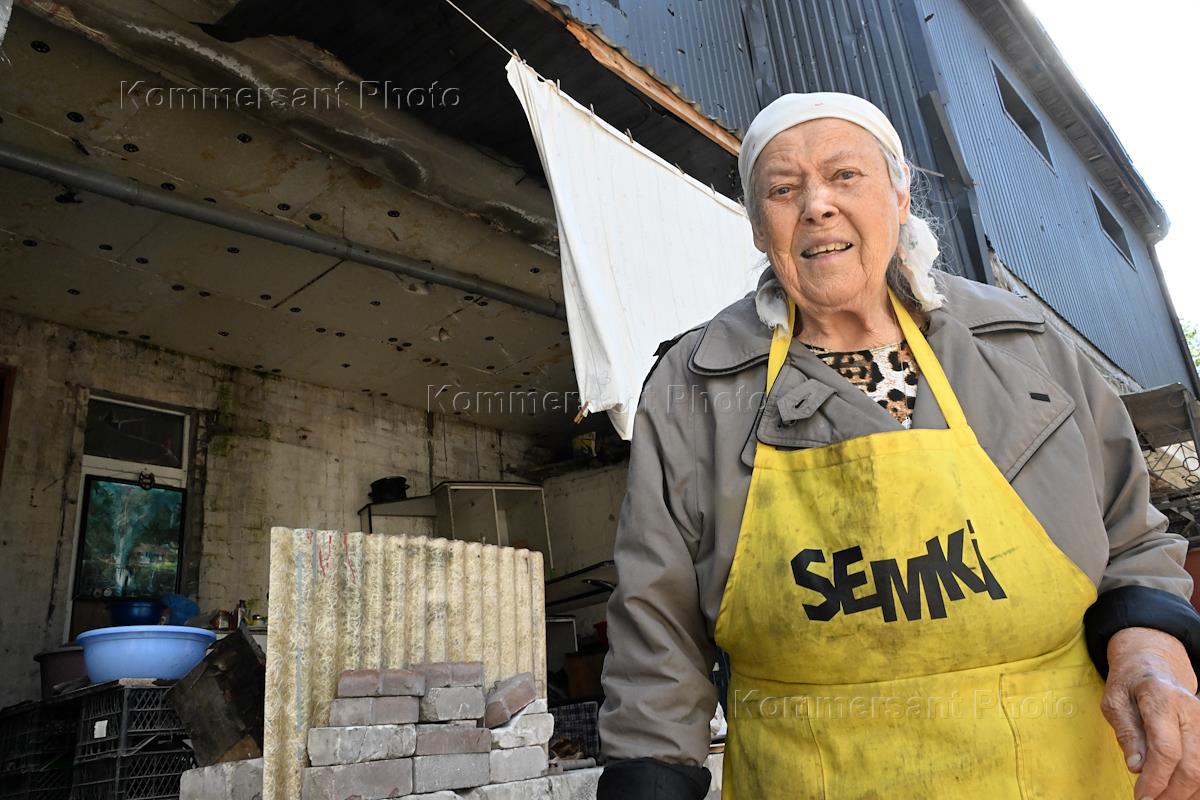 Проведение референдумов о вхождении в состав России Донецкой народной республики (ДНР), Луганской народной республики (ЛНР) и освобожденных территорий. Жанровая фотография. Пожилая женщина во дворе дома.