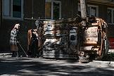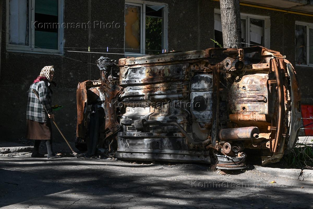 Проведение референдумов о вхождении в состав России Донецкой народной республики (ДНР), Луганской народной республики (ЛНР) и освобожденных территорий. Жанровая фотография. Виды Донецкой области. Сожженный автомобиль во дворе жилого дома.