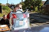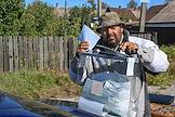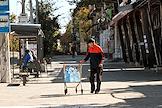 Проведение референдумов о вхождении в состав России Донецкой народной республики (ДНР), Луганской народной республики (ЛНР) и освобожденных территорий. Жанровая фотография. Мужчина с продуктовой тележкой с бутылками воды.