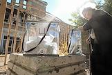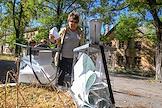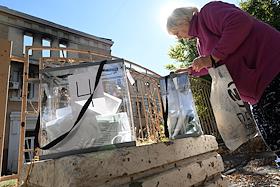 Проведение референдумов о вхождении в состав России Донецкой народной республики (ДНР), Луганской народной республики (ЛНР) и освобожденных территорий. Жанровая фотография. Женщина убирает мусор во дворе жилого дома.