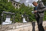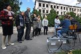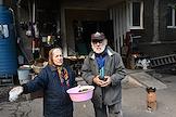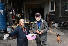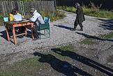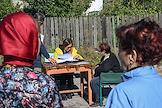 Проведение референдумов о вхождении в состав России Донецкой народной республики (ДНР), Луганской народной республики (ЛНР) и освобожденных территорий. Жанровая фотография. Пожилые люди во дворе дома.