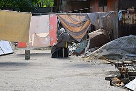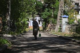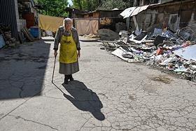 Проведение референдумов о вхождении в состав России Донецкой народной республики (ДНР), Луганской народной республики (ЛНР) и освобожденных территорий. Жанровая фотография. Пожилая женщина во дворе дома.