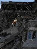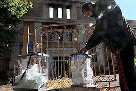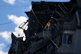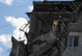 Проведение референдумов о вхождении в состав России Донецкой народной республики (ДНР), Луганской народной республики (ЛНР) и освобожденных территорий. Жанровая фотография. Виды Донецкой области. Паук в паутине на фоне разрушенного после обстрелов жилого дома.