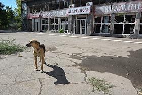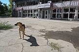 Проведение референдумов о вхождении в состав России Донецкой народной республики (ДНР), Луганской народной республики (ЛНР) и освобожденных территорий. Жанровая фотография. Виды Донецкой области. Собака на фоне магазина "Мариуполь".