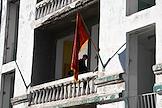 Проведение референдумов о вхождении в состав России Донецкой народной республики (ДНР), Луганской народной республики (ЛНР) и освобожденных территорий. Жанровая фотография. Флаг ДНР на разрушенном здании.