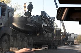 Проведение референдумов о вхождении в состав России Донецкой народной республики (ДНР), Луганской народной республики (ЛНР) и освобожденных территорий. Жанровая фотография. Виды Донецкой области. Военная техника во время транспортировки на тягаче.