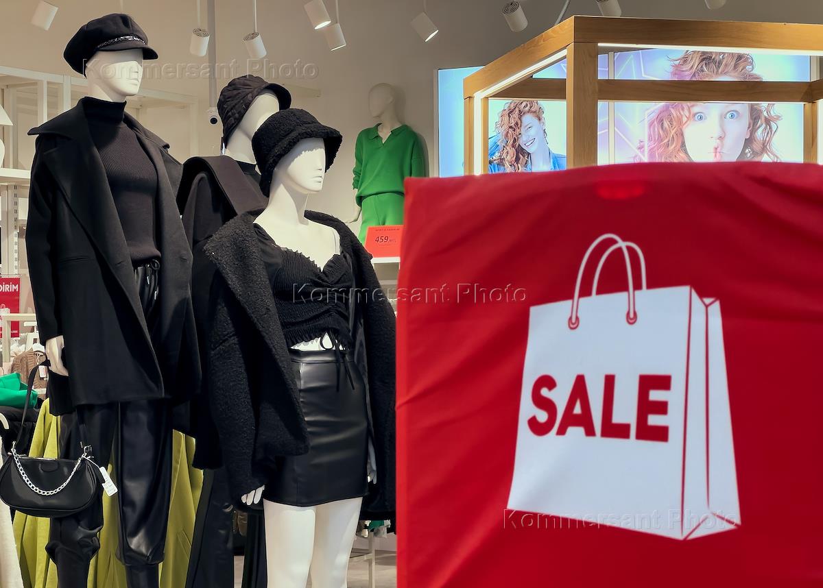 Genre photography. Views of Turkey. Sale in a clothing store. Poster with the inscription Sale.