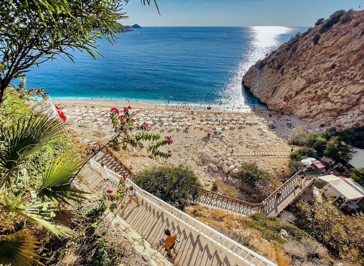 Views of the city of Kas. Genre photography. Vacationers on the beach.