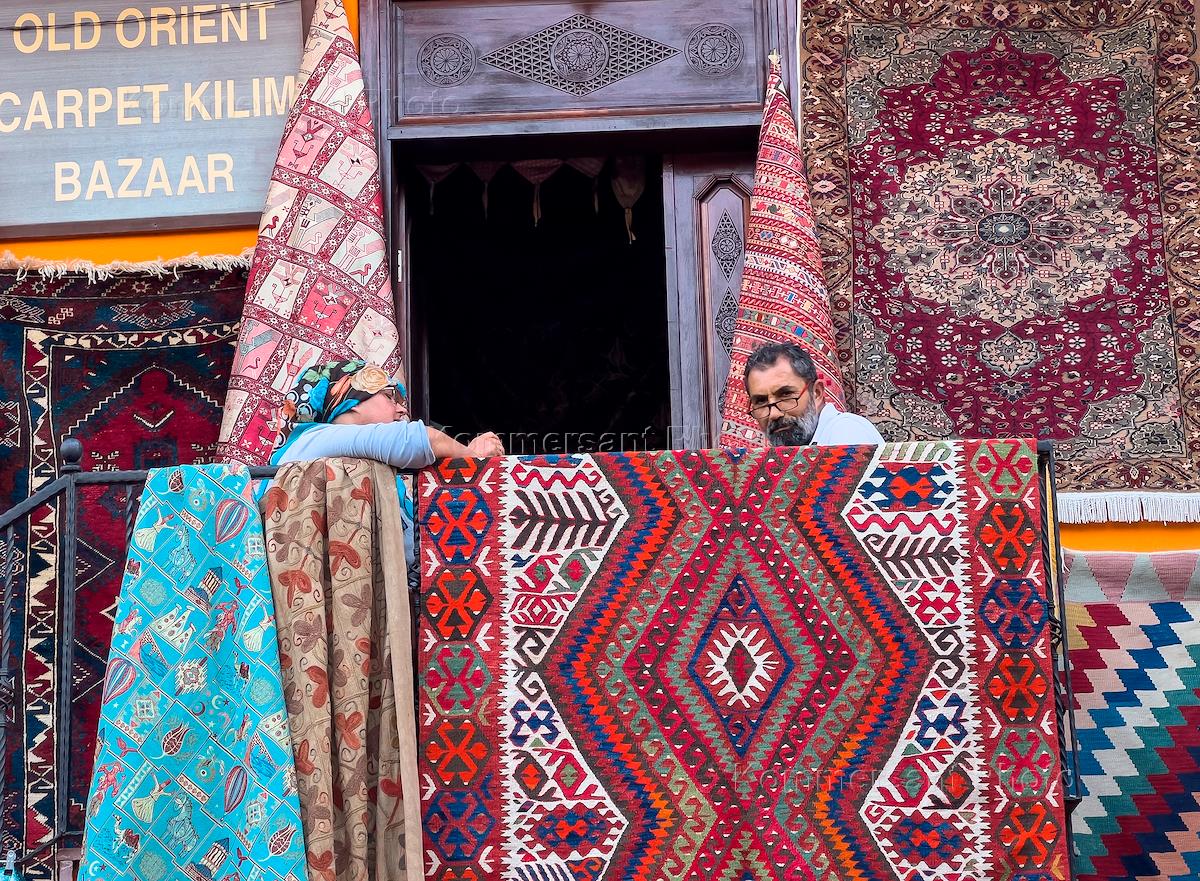 Views of Turkey. Genre photography. Carpet seller at the entrance to the store.