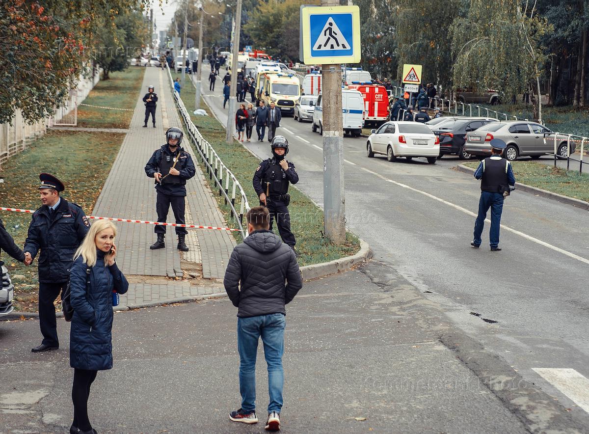 Сотрудники правоохранительных органов, МЧС России у здания школы №88, где произошла стрельба. Неизвестный мужчина ворвался в здание школы и открыл стрельбу по детям. Сотрудники полиции у трупа на улице.