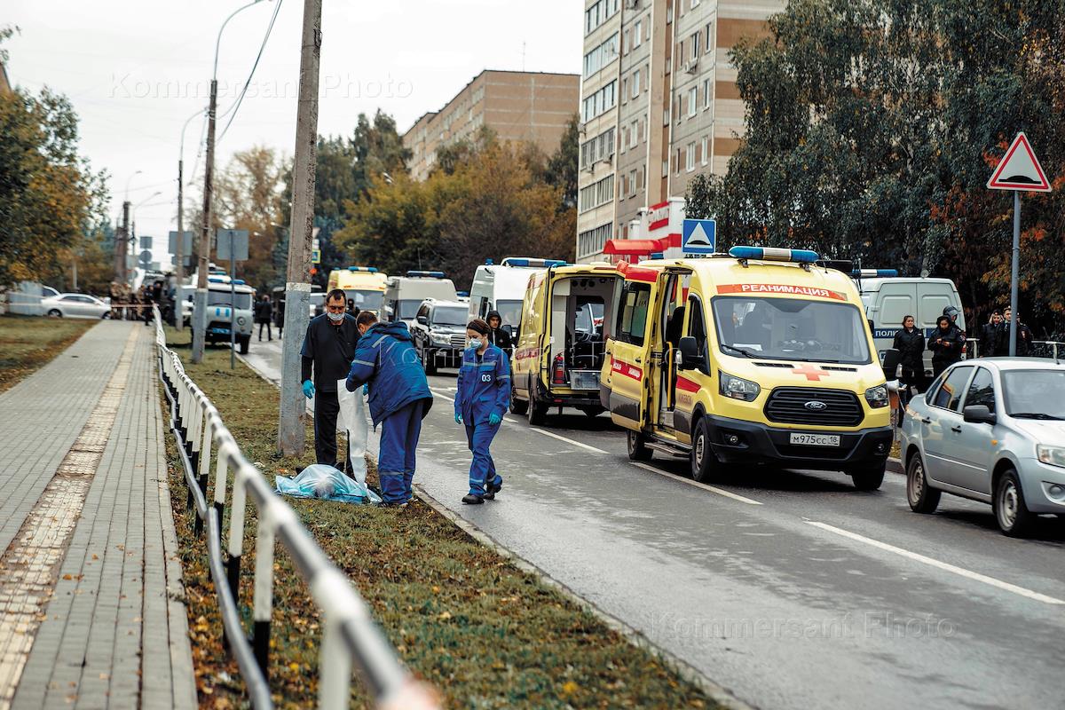 Обстановка у школы №88, где произошла стрельба. Неизвестный мужчина ворвался в здание школы и открыл стрельбу по детям. Сотрудники скорой помощи трупа на улице у здания школы.