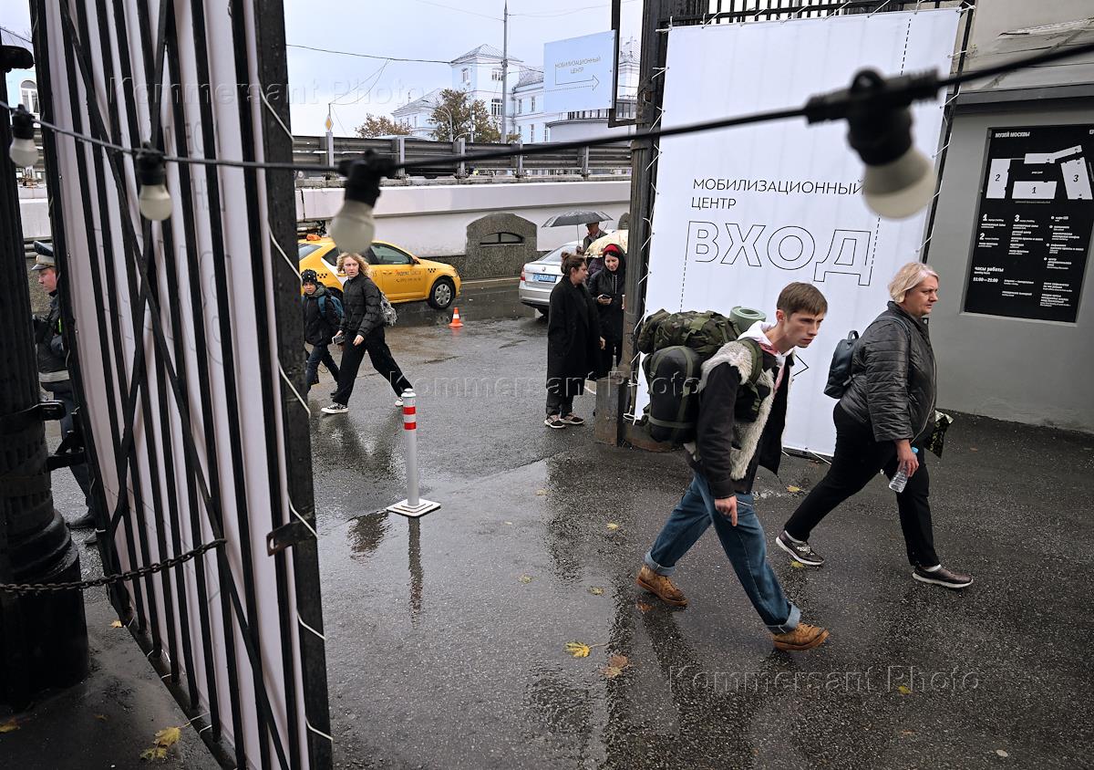 Проведение частичной военной мобилизации, объявленной президентом России Владимиром Путиным 21 сентября 2022 года. Жанровая фотография. Мобилизованные граждане и добровольцы на территории временного призывного пункта в Музее Москвы.