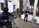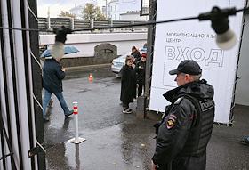 Организация частичной военной мобилизации. Временный призывной пункт в Музее Москвы. Жанровая фотография. Сотрудник полиции на территории призывного пункта.