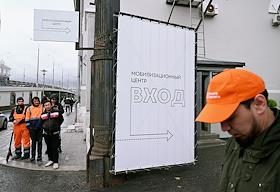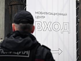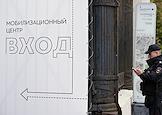 Организация частичной военной мобилизации. Музей Москвы- временный пункт мобилизации. Жанровая фотография. Сотрудник полиции у указателя "Вход в мобилизационный центр".