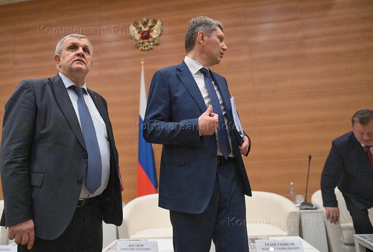 Встреча депутатов фракции КПРФ с министром экономического развития России Максимом Решетниковым в Государственной Думе (ГД) России. Министр экономического развития России Максим Решетников (слева) и лидер КПРФ, член комитета ГД России по делам Содружества Независимых Государств, евразийской интеграции и связям с соотечественниками Геннадий Зюганов (справа) перед началом встречи.