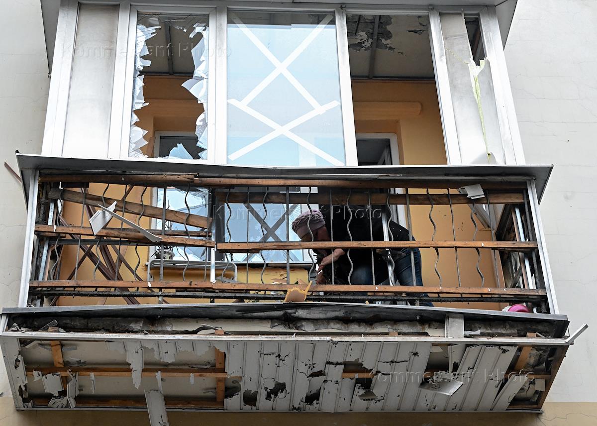 Последствия обстрела центра города. Мужчина закрывает пленкой разбитое окно в жилом доме на Университетской улице.