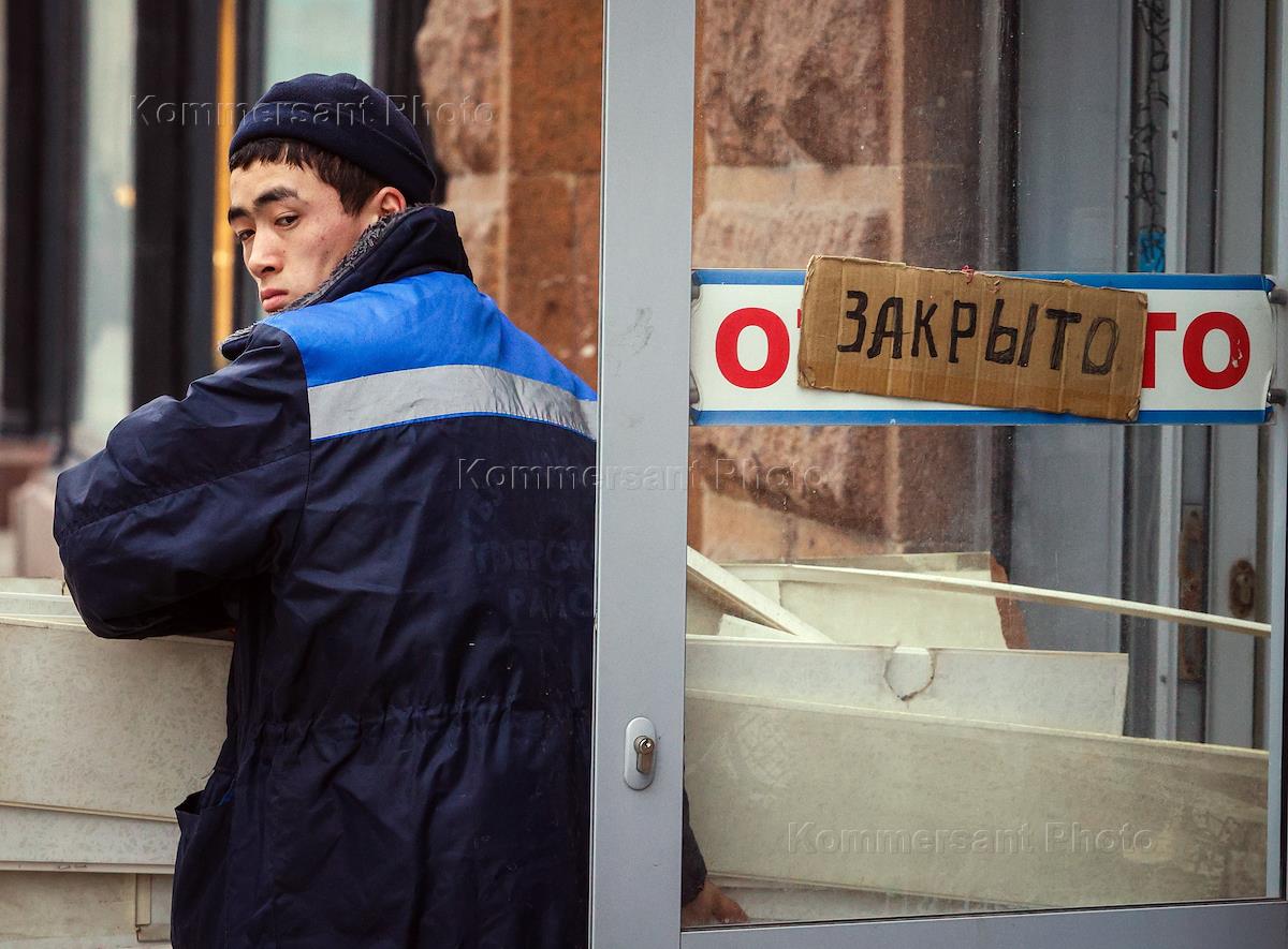Жанровая фотография. Рабочий выносит стройматериалы из закрытого магазина.