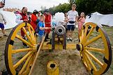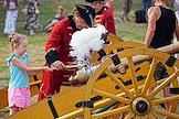 Фестиваль "Русское поле" в музее-усадьбе "Коломенское". Участник реконструкции с девочкой стреляют из пушки.
