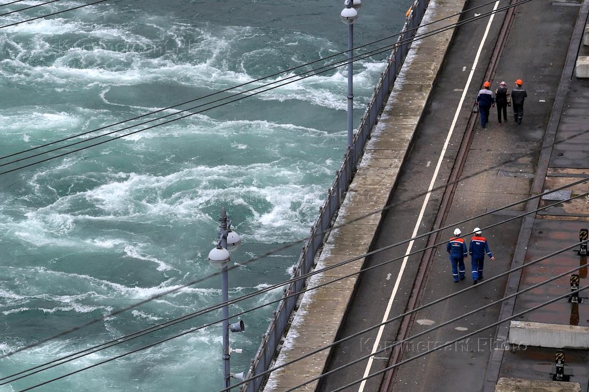 Пресс-тур "20 лет компании En+ Олега Дерипаски". Виды Иркутской гидроэлектростанции (Иркутская ГЭС) на реке Ангаре в Свердловском округе города Иркутска. Жанровая фотография.