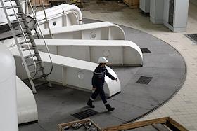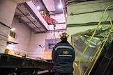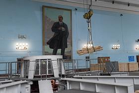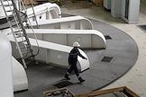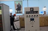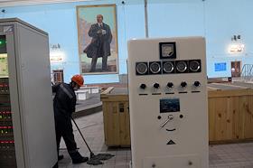 Пресс-тур "20 лет компании En+ Олега Дерипаски". Иркутская гидроэлектростанция (Иркутская ГЭС) на реке Ангаре в Свердловском округе города Иркутска. Жанровая фотография. Уборка в машинном зале ГЭС.