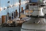 Пресс-тур "20 лет компании En+ Олега Дерипаски". Иркутская гидроэлектростанция (Иркутская ГЭС) на реке Ангаре в Свердловском округе города Иркутска. Жанровая фотография. Козловые краны на плотине станции.