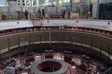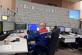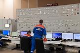 Пресс-тур "20 лет компании En+ Олега Дерипаски". Иркутская гидроэлектростанция (Иркутская ГЭС) на реке Ангаре в Свердловском округе города Иркутска. Жанровая фотография. Сотрудники за пультом управления гидроэлектростанцией.